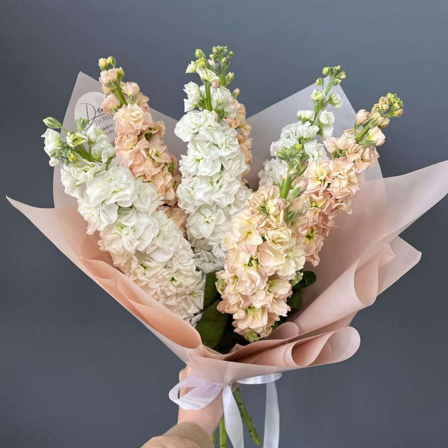 На фото букет из 7 белых маттиол. В составе: маттиола 7 шт, крафт-бумага 1 шт, вероника 1 шт, . Все цветы свежие и ароматные, букет красиво оформлен и отлично подходит для подарка. Доступна доставка цветов или самовывоз.